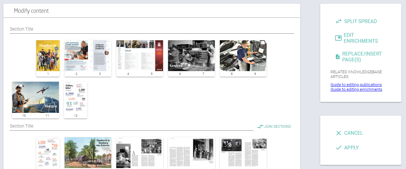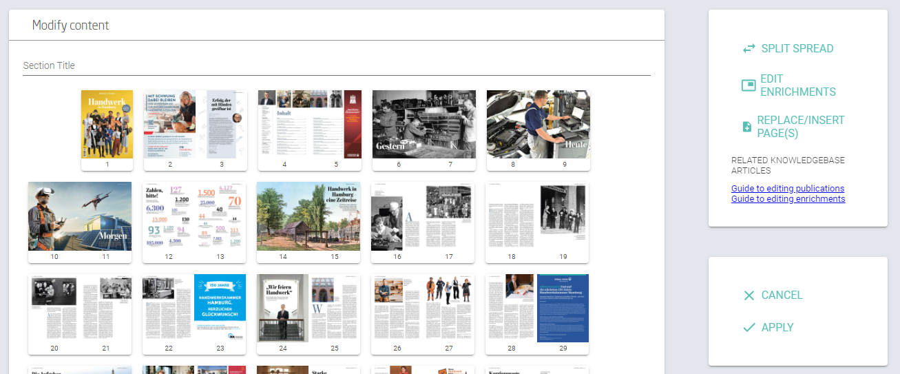 When uploading a publication manually, you can specify release and end date, you can manually specify the order of pages through drag and drop, you can edit where sections divide the publication and you can delete a publication. How you do all this is described below.